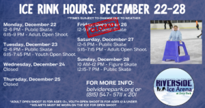 Public Skate Times: Monday-Thursday – See Schedule Above • Friday: 4-9 PM • Saturday: Noon-5 PM • Sunday: 12:15-7 PM